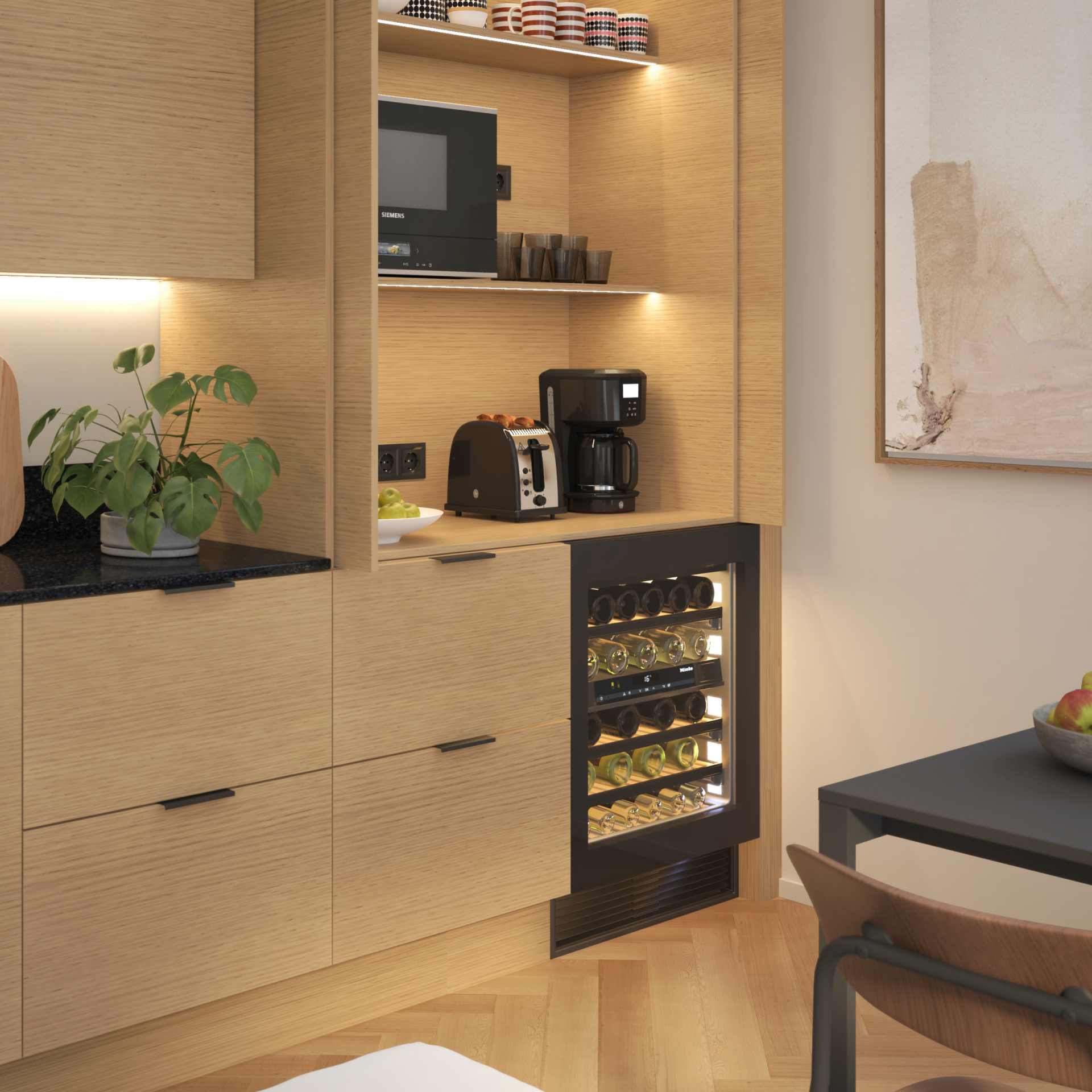 Valikoimasta löytyy kodinkoneiden tasovaihtoehtoja myös vaativampaan käyttöön. Lisäksi voit sisällyttää keittiöösi myös unelmiesi aamiaiskaapin sekä viinikaapin.